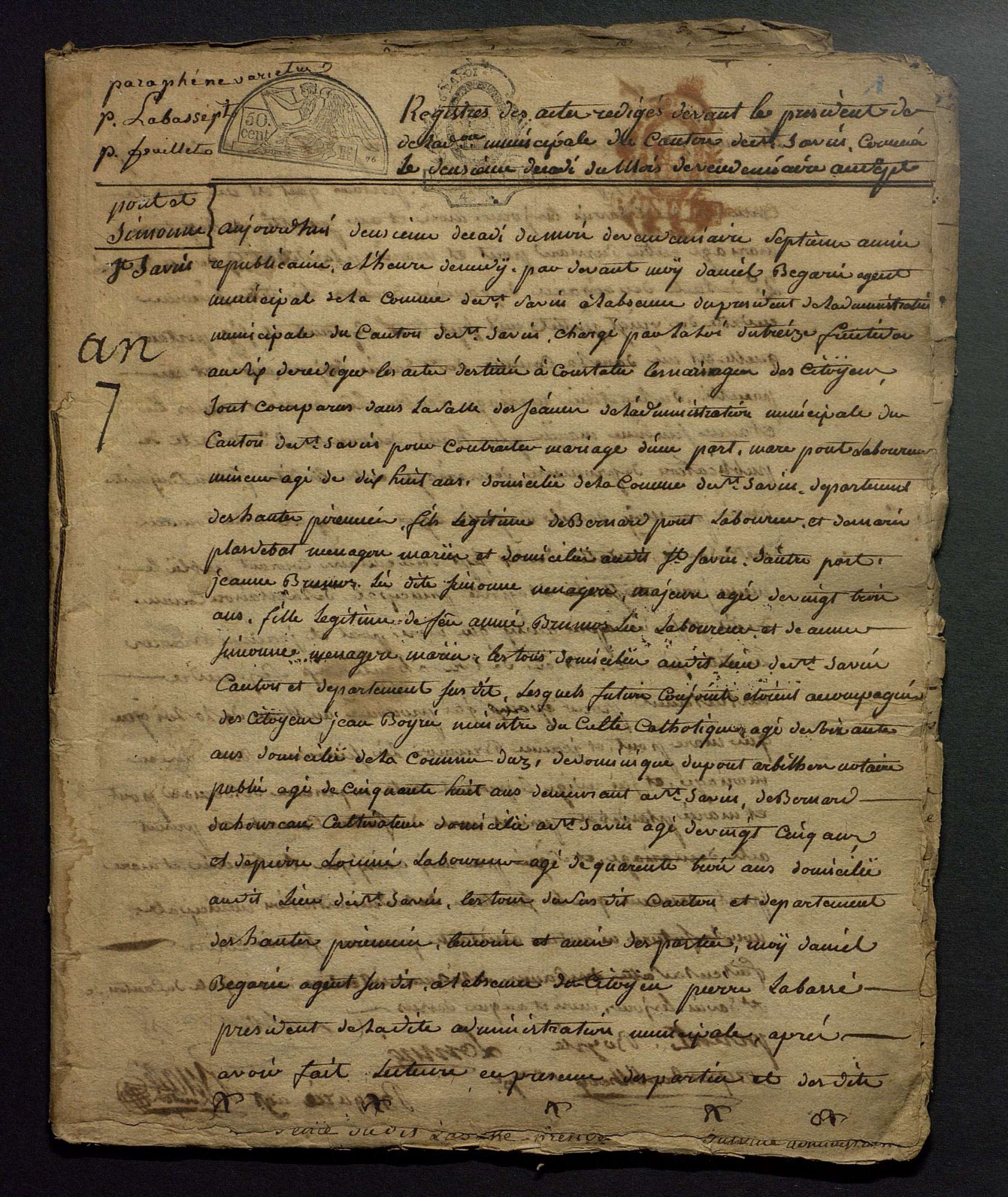 En outre, les mariages de l'an VII et de l'an VIII étaient célébrés au chef-lieu de canton et donc retranscrites dans le registre du chef-lieu de canton. Pour en faciliter l'accès, nous avons indexé tous ces mariages à la commune de rattachement.