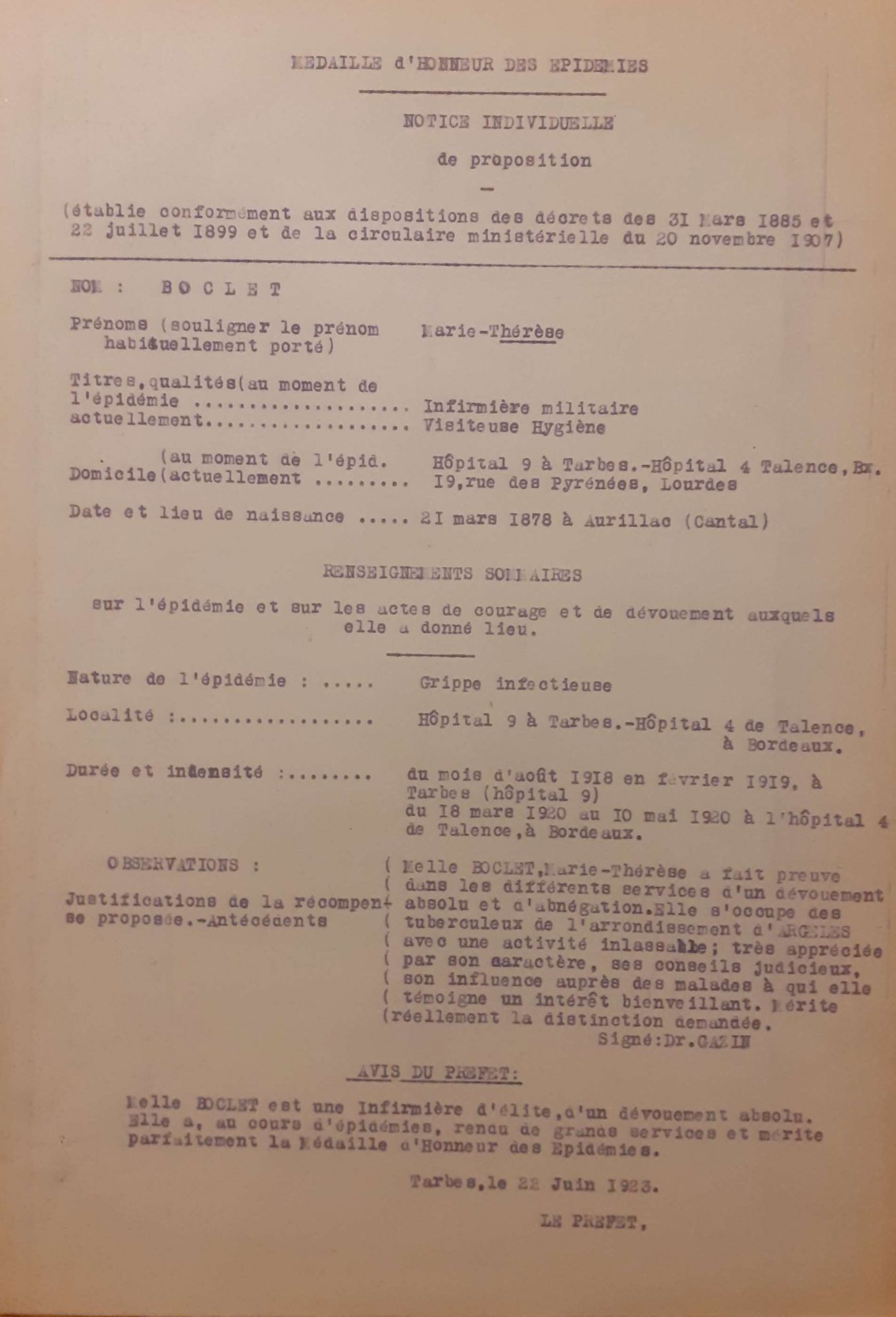 Ou encore celui de l’infirmière et visiteuse d’hygiène, Marie-Thérèse Boclet, récompensée de la médaille de bronze des épidémies en 1923 pour son attitude face, une fois de plus, à la grippe espagnole, tout d’abord au sein de l’hôpital de Tarbes de 1918 à 1919 puis au sein de celui de Talence en 1920. Installée à Lourdes lors de l’obtention de cette distinction, elle s’occupe alors de manière bénévole des tuberculeux de l’arrondissement d’Argelès…