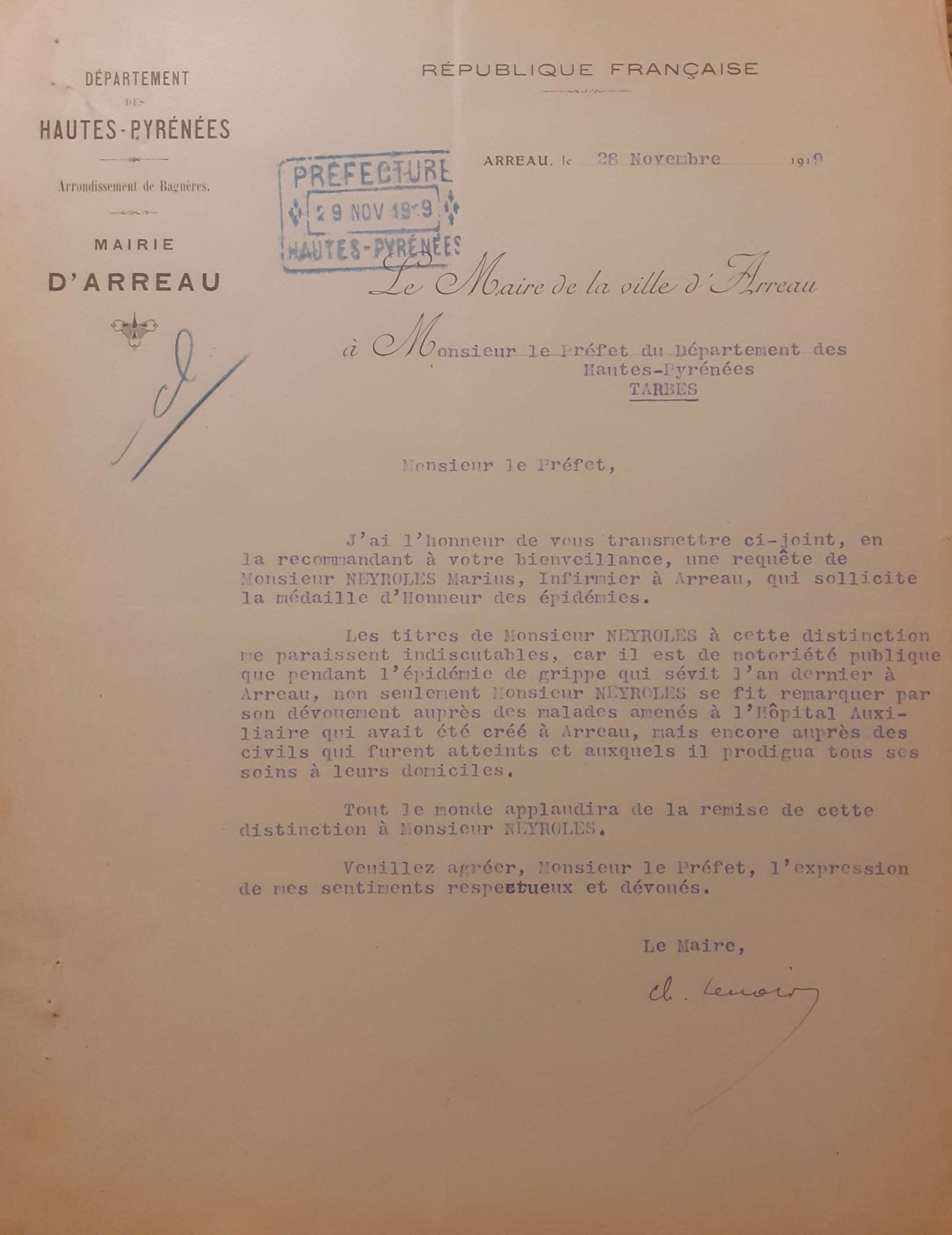 Notons, par exemple, le cas de Marius Neyrolles. En 1919, le maire d’Arreau vante ainsi l’abnégation de cet infirmier qui durant l’épidémie de grippe espagnole « se fit remarquer par son dévouement auprès des malades amenés à l’hôpital auxiliaire qui avait été créé à Arreau, mais encore auprès des civils (…) auxquels il prodigua tous les soins à leurs domiciles ».