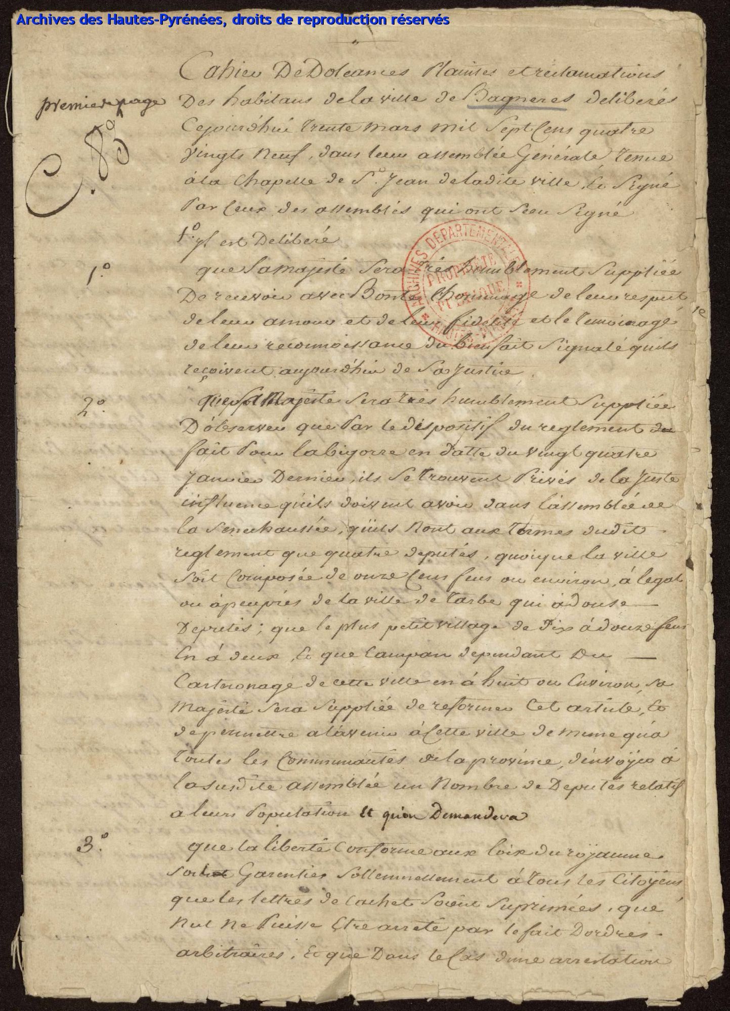 Retrouvez ici le cahier de doléances de la communauté de Bagnères-de-Bigorre. Ce document est conservé sous la cote 1 C 273 / 1.