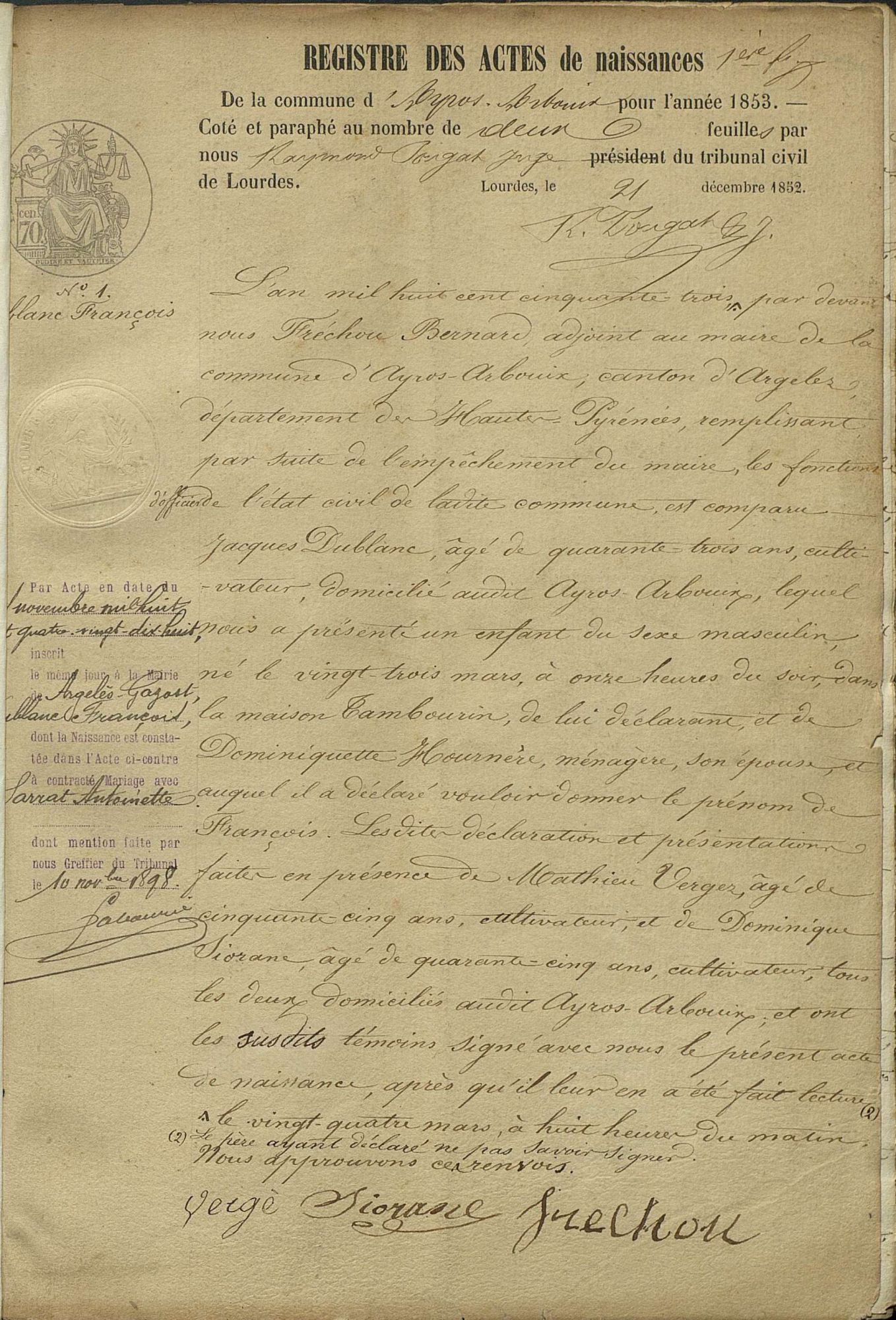 - les registres d'état civil du Greffe des arrondissements d'Argelès-Gazost, Bagnères-de-Bigorre et de Tarbes (An XI – 1892), 2 E 3.