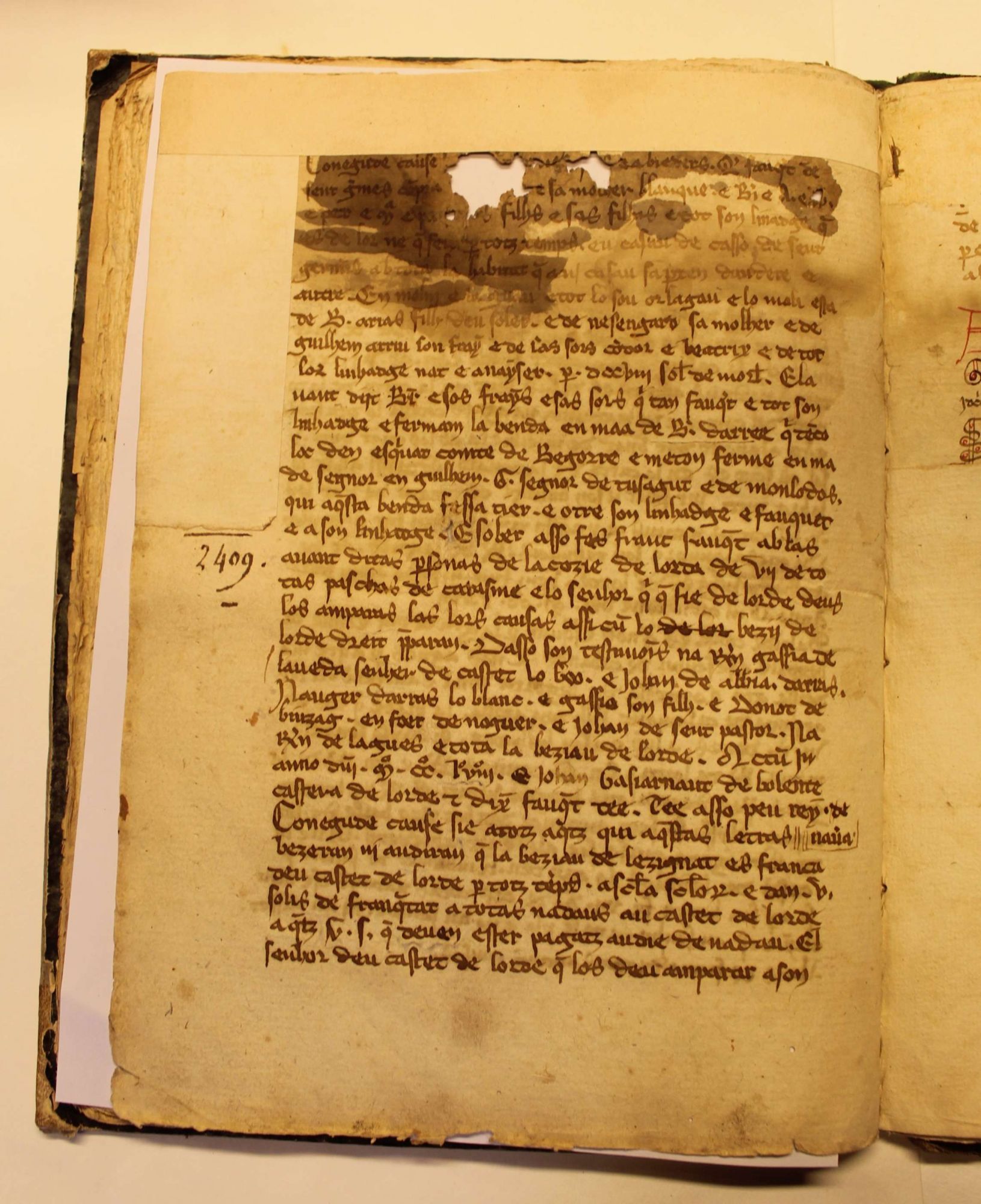 Conservé par les Archives départementales des Pyrénées Atlantiques sous la cote E 368, ce registre avait alors fait l'objet d'un prêt le temps de l'exposition. Au regard de son état et bénéficiant d'un atelier de restauration et de reliure in situ, nous avons proposé à nos collègues béarnais d'assurer la restauration de ce précieux document, sorte de contrepartie au prêt accordé.