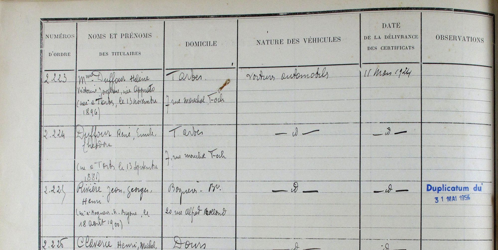 Par sa mission de collecte des documents produits par la préfecture, le service des Archives départementales conserve aujourd’hui une riche documentation sur le permis de conduire, en particulier les registres d’attribution du certificat de capacité et du permis de conduire à l’image de l’illustration : cet extrait datant de 1924 renseigne en effet sur les nouveaux conducteurs parmi lesquelles figurent plusieurs conductrices (cote : 1507 W 1).