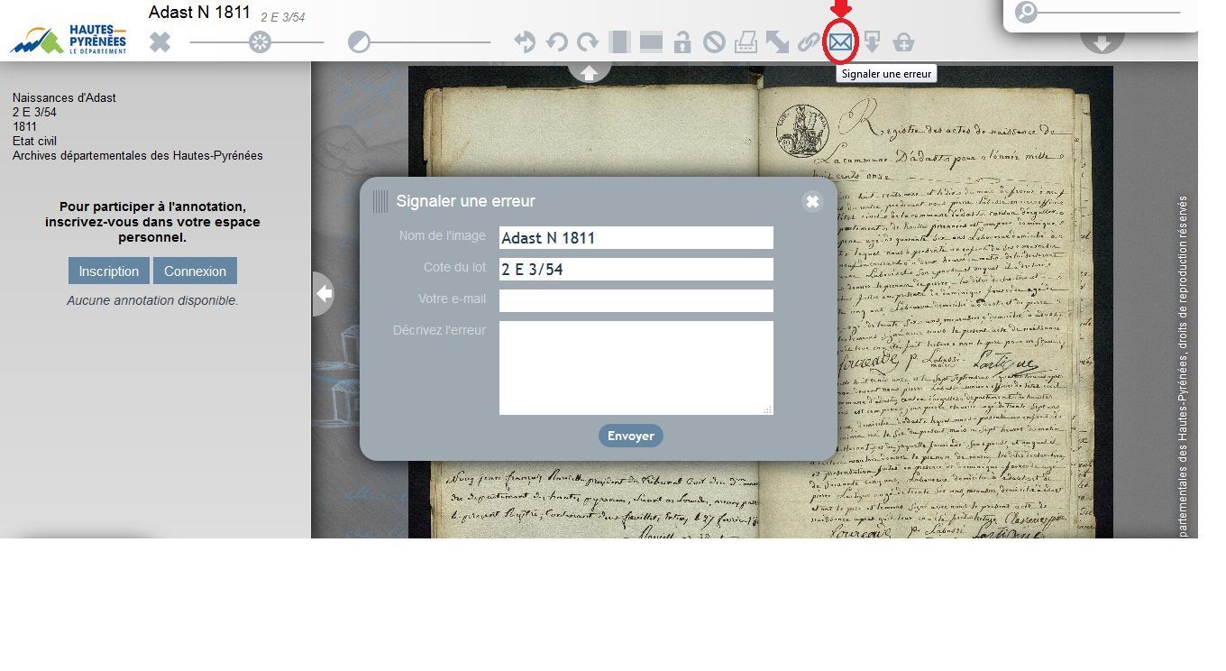 Pour nous le faire savoir, vous disposez, dans la visionneuse, d’un bouton spécifique en forme d’enveloppe sur le bandeau supérieur. Ce bouton ouvre un formulaire dans lequel vous pouvez indiquer vos observations.