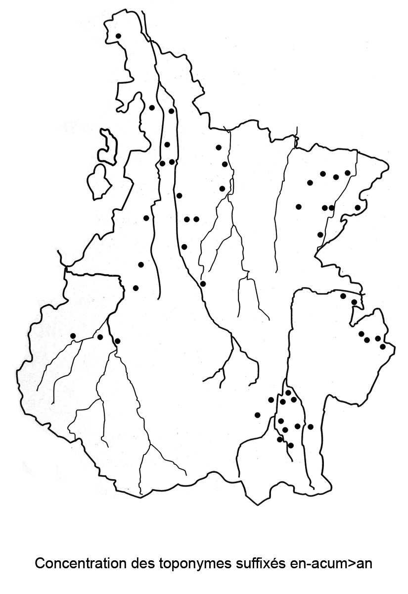 Première remarque : étant donné que ce suffixe d’origine gauloise a été importé chez nous par la conquête romaine, il ne peut pas être antérieur au suffixe -an(um). Les toponymes suffixés en -ac(um) sont ou contemporains ou postérieurs aux toponymes suffixés en -an(um). Par contre, dans les régions de peuplement gaulois, rien n’empêche qu’un nom en -ac soit antérieur à la conquête romaine.