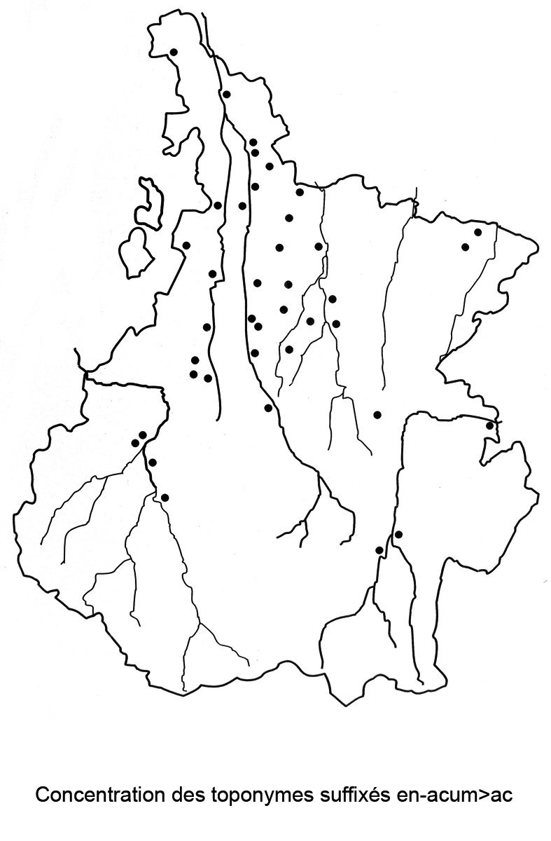 Deuxième remarque : le suffixe -ac existe en Gascogne, Languedoc, Périgord, Limousin. Il est absent de la Provence. On le rencontre aussi dans le sud des Charentes (Cognac, Jarnac, etc.) et dans une bande de territoires bretons (Loudéac, la Baule-Escoublac, etc.). Dans les régions de Langue d’Oïl, il a évolué en -y ou en –é.